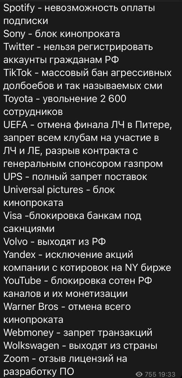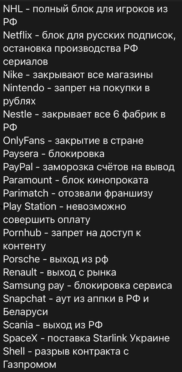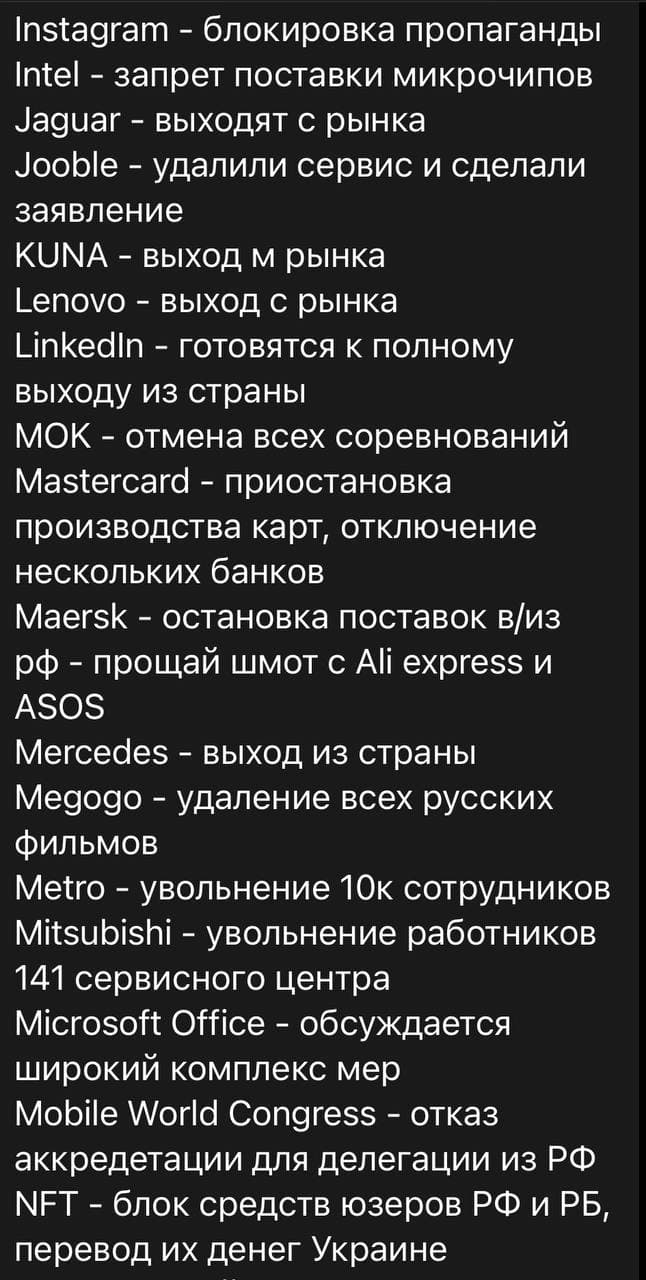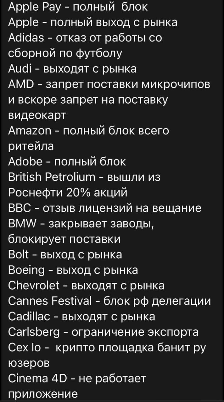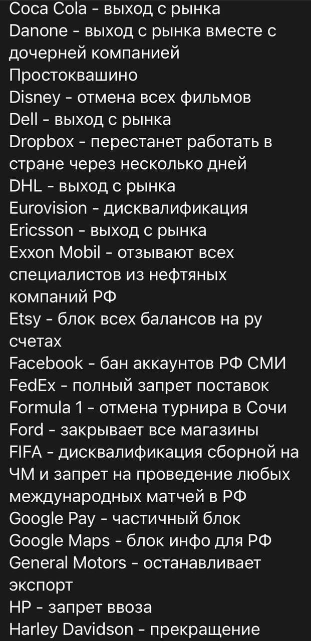 Apple — полный выход с рынка; Adidas — отказ от работы со Сборной по футболу; Audi — выходят с рынка; AMD — запрет поставки микрочипов и вскоре запрет на поставку видеокарт; British Petrolium — вышли из Роснефти 20% акций; BBC — отзыв лицензий на вещание; BMW — закрывает заводы, блокирует поставки; Bolt — выход с рынка; Boeing — выход с рынка; Chevrolet — выходят с рынка; Danone — выход с рынка вместе с дочерней компанией Простоквашино; Disney — отмена всех фильмов; Dell — выход с рынка; DHL — выход с рынка; Eurovision — дисквалификация; Ericsson — выход с рынка; Exxon Mobil — отзывают всех специалистов из нефтяных компаний РФ; FedEx — полный запрет поставок; Formula 1 — отмена турнира в Сочи; Ford — закрывает все магазины; FIFA — дисквалификация сборной на ЧМ и запрет на проведение любых международных матчей в РФ; General Motors — останавливает экспорт; HP — запрет ввоза; Harley Davidson — прекращение поставок; Intel — запрет поставки микрочипов; Jaguar — выходят с рынка; Lenovo — выход с рынка; MOK — отмена всех соревнований; MasterCard — приостановка производства карт, отключение нескольких банков; Megogo — удаление всех русских фильмов; Mitsubishi — увольнение работников 141 сервисного центра; Microsoft Office — обсуждается широкий комплекс мер; Netflix — блок для русских подписок, остановка производства РФ сериалов; Nike — закрыта доставка в РФ; Nestle — закрывает все 6 фабрик в РФ; OnlyFans — закрытие в стране; PayPal — заморозка счётов на вывод; Paramount — блок кинопроката; PornHub — запрет на доступ к контенту; Porsche — выход из рф; Renault — выход с рынка; Samsung pay — блокировка сервиса; Scania — выход из РФ; Shell — разрыв контракта с Газпромом; Sony — блок кинопроката; Twitter — нельзя регистрировать аккаунты гражданам РФ; Toyota — прекращение поставок; UEFA — отмена финала ЛЧ в Питере, запрет всем клубам на участие в ЛЧ и ЛЕ, разрыв контракта с генеральным спонсором газпром; UPS — полный запрет поставок; Universal pictures — блок кинопроката; Visa — блокировка банкам под сакнциями; Volvo — выходят из РФ; Yandex — исключение акций компании с котировок на NY бирже; YouTube — блокировка сотен РФ каналов и их монетизации; Warner Bros — отмена всего кинопроката; Volkswagen — выходят из страны. H&M — прекратил поставки Прикрепления: