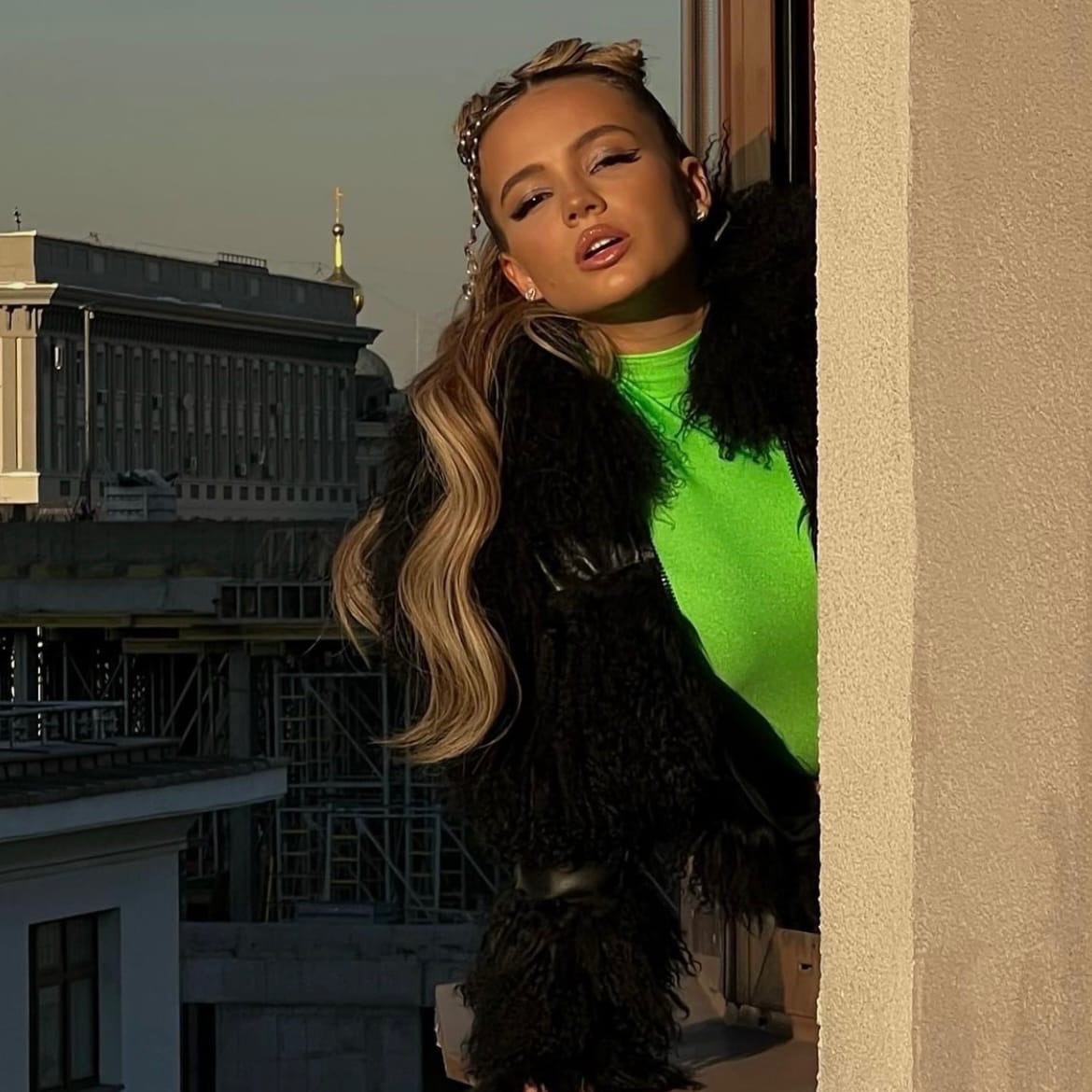 Валя разгуливала по улицам города в эффектном наряде, а также грациозно выглядывала из окна, позируя на фоне городского пейзажа. Стилисты выбрали для Карнавал ярко-зеленую кофточку с укороченной черной шубкой, а также брюки с расцветкой &..