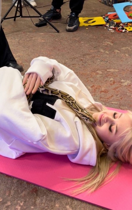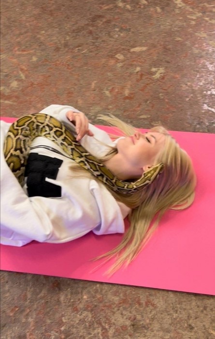 На них видно, как Ди лежит на розовом коврике в объятиях с живой змеей. Представитель пресмыкающихся активно изучал новую партнершу, а по эмоциям тиктокерши не очень понятно, как ей такое близкое ..