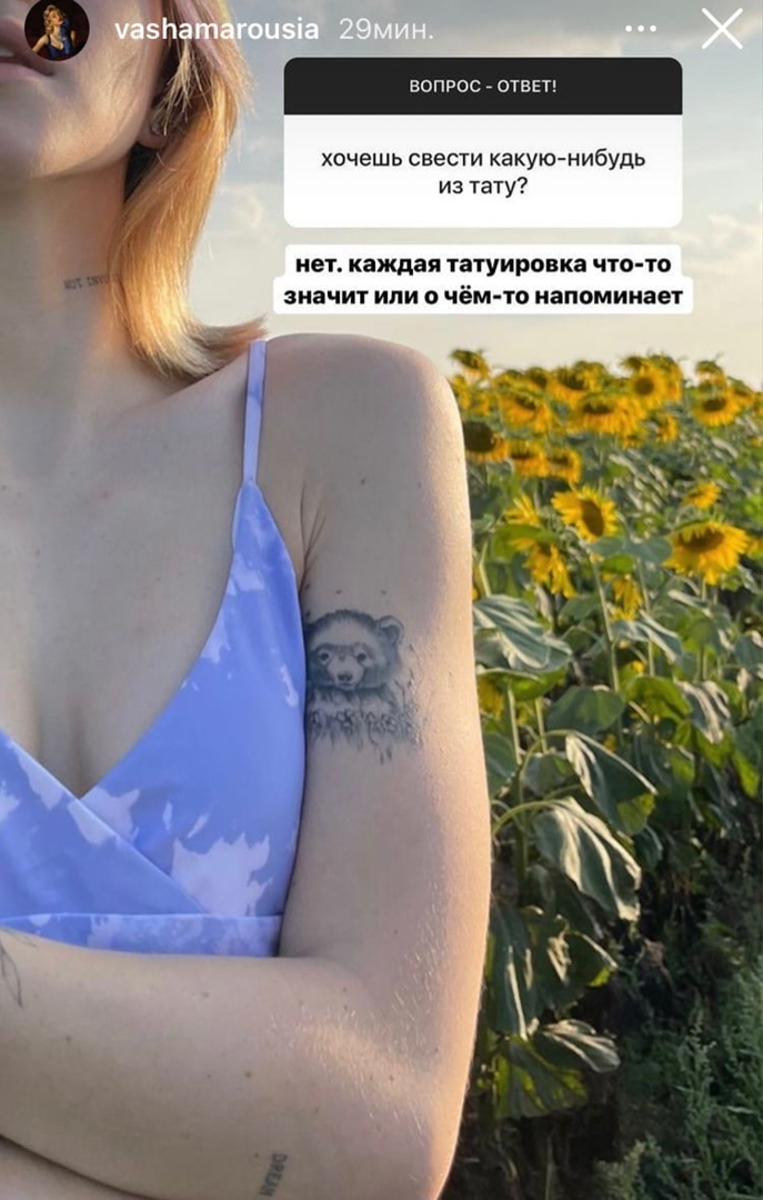 Маруся прикрепила к ответу фотографию, где заметна ее тату, эскиз которой нарисовал для нее бывший молодой человек Олег Романенко. Блогерша заявила, что каждая татуировка, что-то значит для нее и о чем-то де..