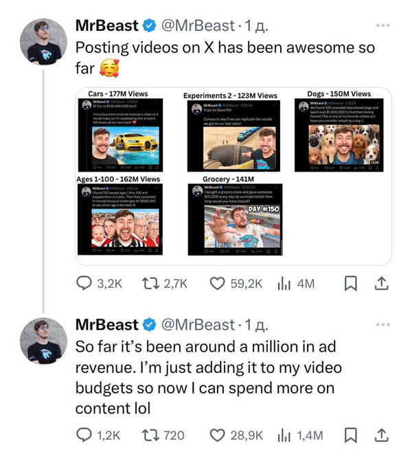 За два с половиной месяца публикации роликов в X (бывший Твиттер) MrBeast заработал около миллиона долларов. Джимми опубликовал 5 своих старых видео, которые ранее были размещены на YouTube, и они набрали от 122 до 177 миллионов просмотров в X.