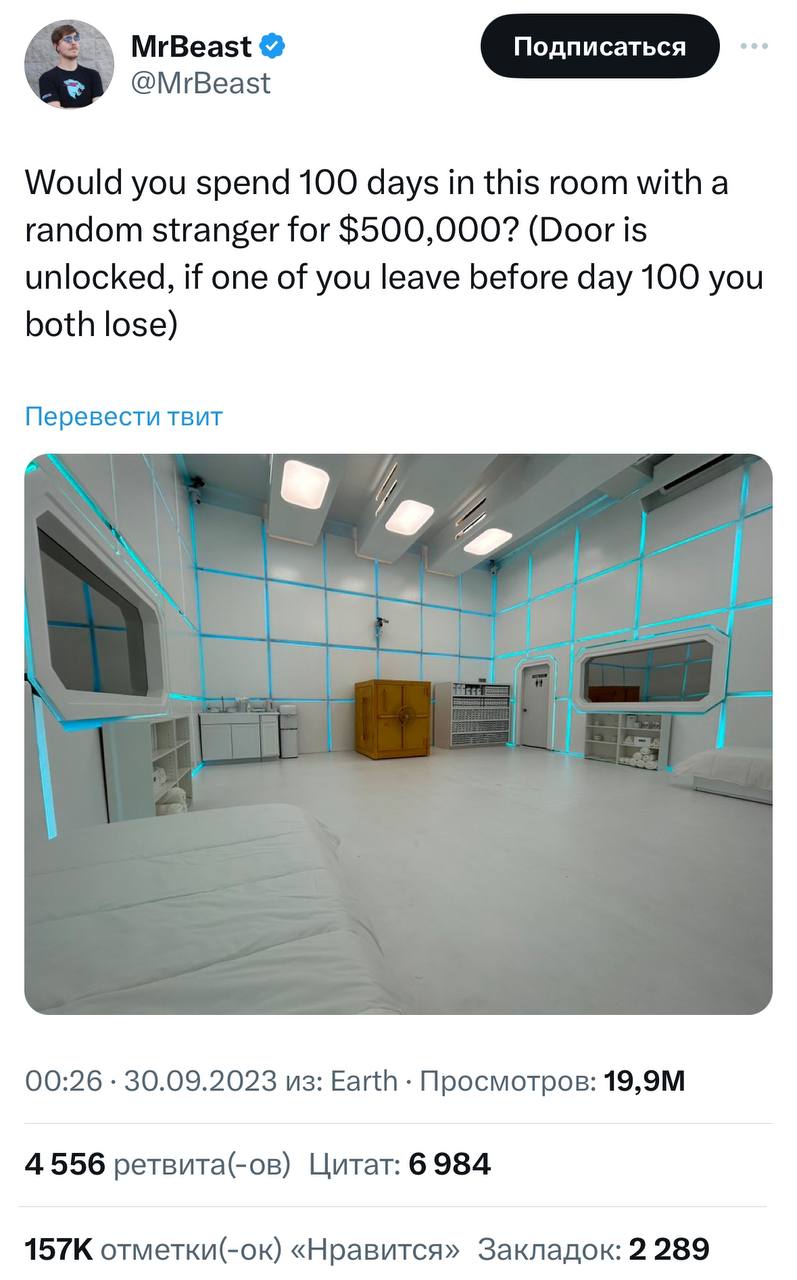Смогли бы вы прожить целых 100 дней в одной комнате с полным незнакомцем? И всего за 500 000 долларов! Это предложение, которое подкинул своим зрителям известный ютубер Mr.Beast. Он собирается провести один из своих самых масштабных экспериментов, чтобы проверить, насколько сильна человеческая психика и способность адаптироваться к новым условиям.