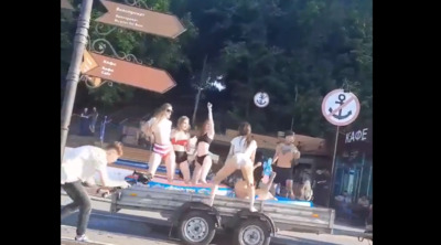 В сети сразу же появился ролик с этим BMW. На нем четко запечатлено, как автомобиль с прицепом не спеша перемещается по набережной. В прицепе раздетые девушки, а на крыше красотка в купальнике танцует под очень громкий музончик.