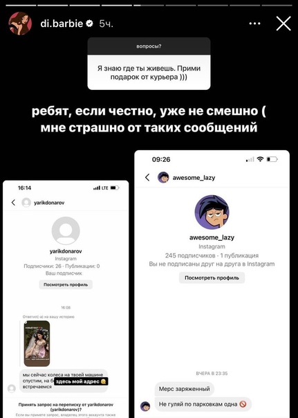 Известная блогерша Диана Астер боится за свою жизнь и здоровье. Стало известно, что в последнее время ее активно сталкерят озабоченные поклонники. На днях блогерша рассказала подписчикам, что активизировались незнакомцы, которые пишут ей пугающие вещи. О том, что они знают по какому адресу девушка, проживает, что мечтают передать подарок, что часто наблюдают за ней издалека, а некоторые и вовсе угрожают испортить ее автомобиль.