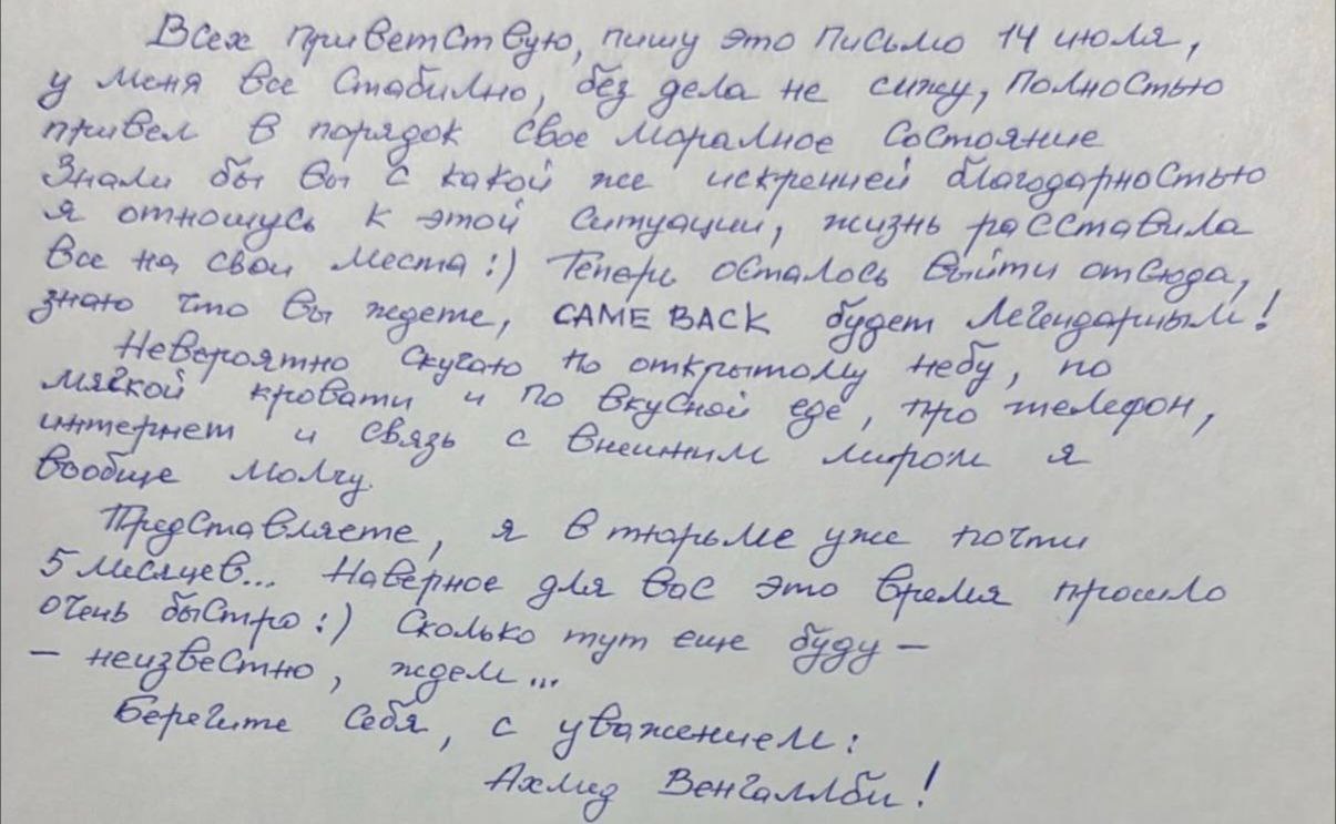 Известный блогер Ахмед Венгалби, находящийся в следственном изоляторе уже почти 5 месяцев, обратился к своим подписчикам с новым посланием. В письме он рассказал о своём текущем положении и душевном состоянии.