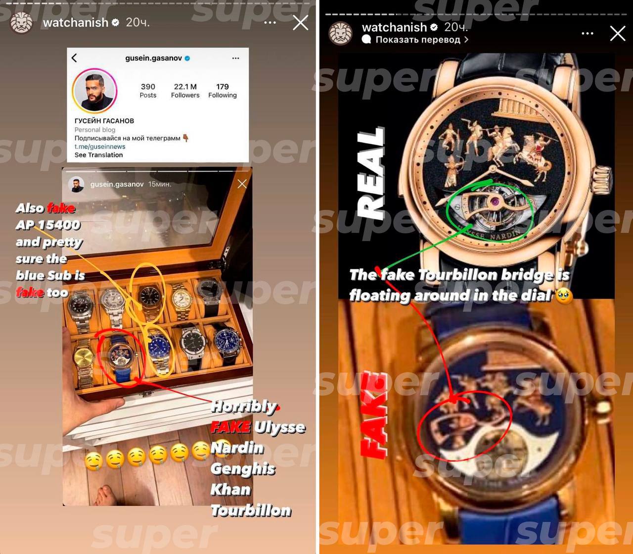 У Гусейна на руке заметили часы Audemars Piguet Royal Oak, которые стоят от 5 млн. руб., Ulysse Nardin Genghis Khan - 20 млн. руб. - обе модели, показанные блогером у себя на запястье оказались подделкой. Даже на посте от 2015 года Hublot Big Bang - тоже фейк. После такого разоблачения Гусейн удалил 24 поста.