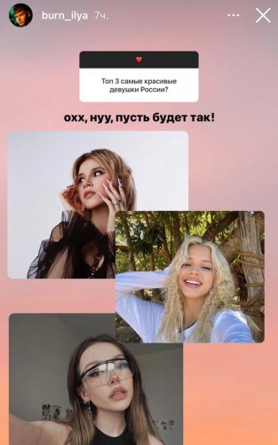 Популярного блогера спросили его мнение о девушках, и он составил свой небольшой топ красоток. Первой конечно была названа его девушка Ваша Маруся. Но кроме нее Илья еще назвал Гаврилину Юлю и Фаю. Маруся пока не комментировала мнение своего парня, но подписчики ожидают реакции.