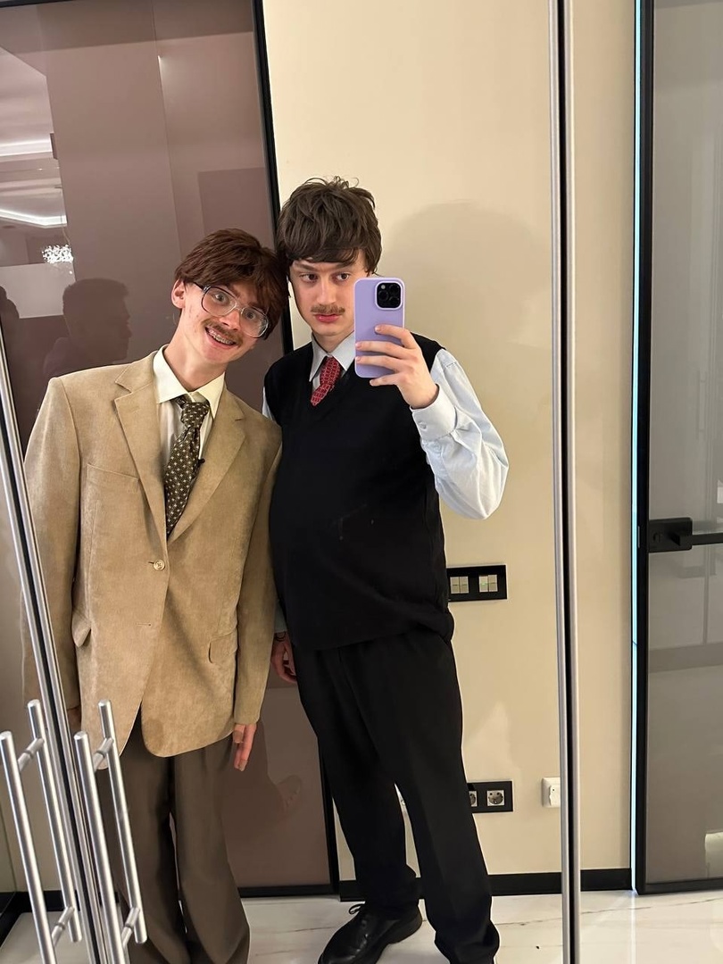 Некоглай обзавелся небольшими усами и огромным почти пивным животом. Поверх такого грима он выбрал весьма атмосферную одежду - безрукавка-свитер, рубашка, брюки, огромные туфли и красный галстук. Милохин также с усами, но больше похож на советского инженера, чем офисный планктон - на нем бежевый мешковатый костюм и светлые штаны, белая рубашка, галстук в горошек и большие очки всезнайки.