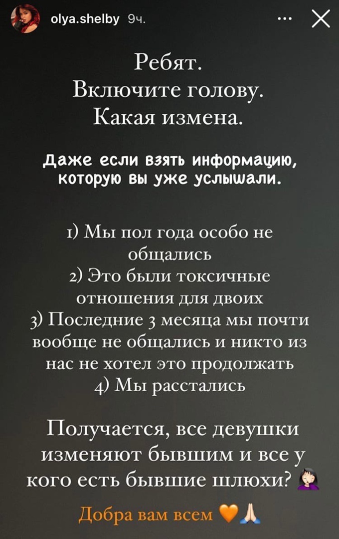 После того как Дима Евтушенко кинул обвинения в адрес своей бывшей девушки, Оли Шелби, в измене, она сразу же ответила ему довольно аргументированным текстом. Оля заявила, что последние полгода они вообще практически не были вместе и отношения стали токсичными.