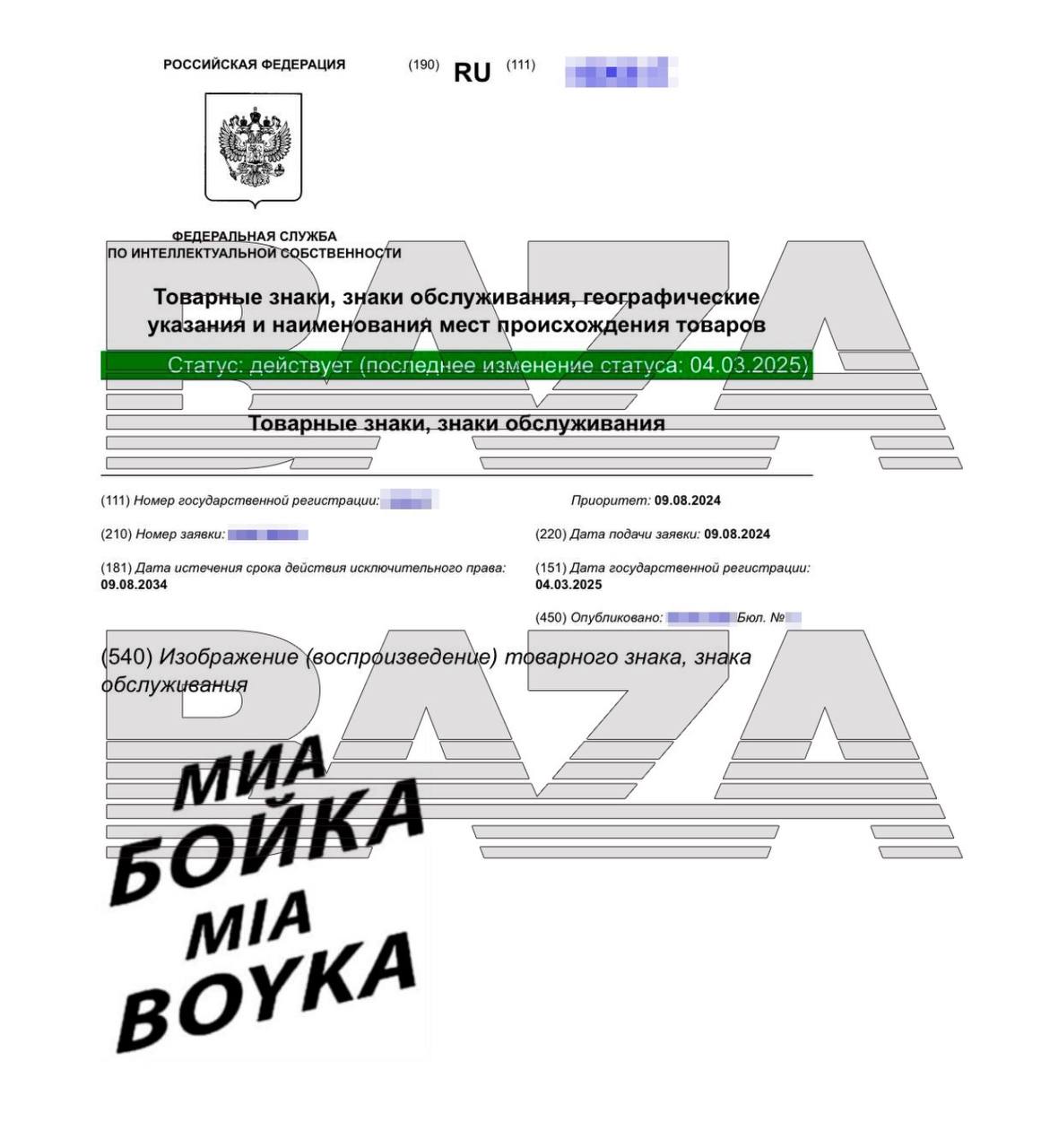 Согласно данным «Базы», певица подала заявку в Роспатент на регистрацию товарного знака ещё в августе прошлого года, но решение было принято только в марте 2025 года. Заявка охватывала различные напитки, включая безалкогольное и алкогольное пиво, энергетики, лимонады, пивное и солодовое сусло, соки и другие. Кроме того, Бойко планировала зарегистрировать предоставление телекоммуникационных услуг для третьих лиц. В заявку вошёл широкий спектр наименований, включая аренду кассового и офисного оборудования, аренду рекламного времени, расклейку объявлений и услуги по повышению эффективности бизнеса.