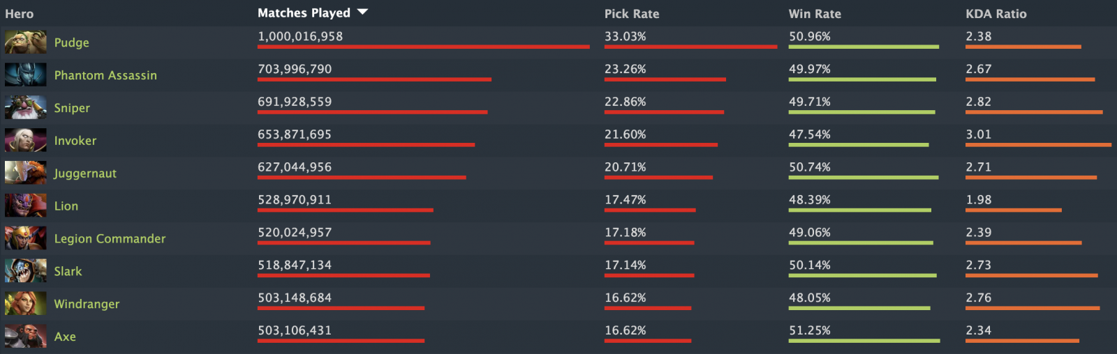 В общей сложности победный процент у Pudge составляет почти 51%, а его средний показатель KDA – 2.38. В топ-5 по этим показателям также входят Phantom Assassin (703 миллиона матчей), Sniper (691 миллион), Invoker (653 миллиона) и Juggernaut (627 миллионов).