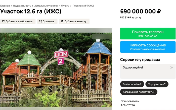 Участок, где некогда разворачивались события реалити-шоу «Дом-2», расположенный в живописном поселке Лобаново, выставлен на продажу за 690 миллионов рублей на специализированном сервисе.