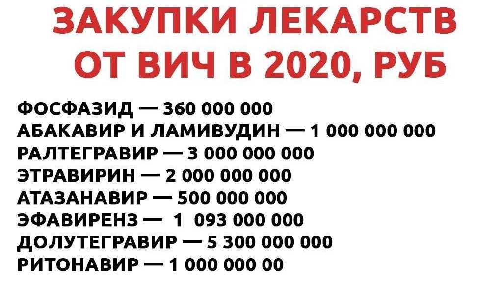 Видимо, в Минздраве поняли, что соревноваться с Африкой стыдно. И начали рекордные закупки. С 27 января по 3 февраля на лекарства, которые должны контролировать репликацию ВИЧ и замедлять развитие болезни, потратили сразу 15 миллиардов.