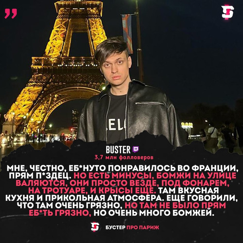 В этом городе сплошная романтика. Бустер сказал, что он оказался в невероятной атмосфере. Блогер сказал, что Париж нельзя ни с чем сравнивать. Здесь в каждом уголке своя история и уникальность. Ему удалось побывать в Эйфелевой башне, Лувре, Соборе Парижской Богоматери, Монмартре. Интересно было узнать все детали, архитектуру зданий