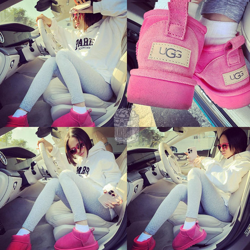 Она сказала, что очень нравится такая комфортная и стильная обувь. Потому приняла решение заняться созданием нового стильного образа. Из этого вышли красочные и яркие фотографии. Девушка воспользовалась розовыми нуггами, которые имеют не очень большие белые цветочные принты. Их дополнила денимовая юбка и комфортный свитшот подобного оттенка.