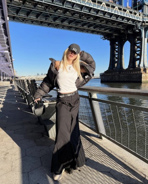 Настя предстала в джинсовой макси-юбке черного цвета с ремнем, скомбинировав ее с белой майкой и укороченным пуховиком. Ее нестандартный образ дополняют кепка, кроссовки, миниатюрная сумочка и цепочки. Аутфит получился на славу. К..
