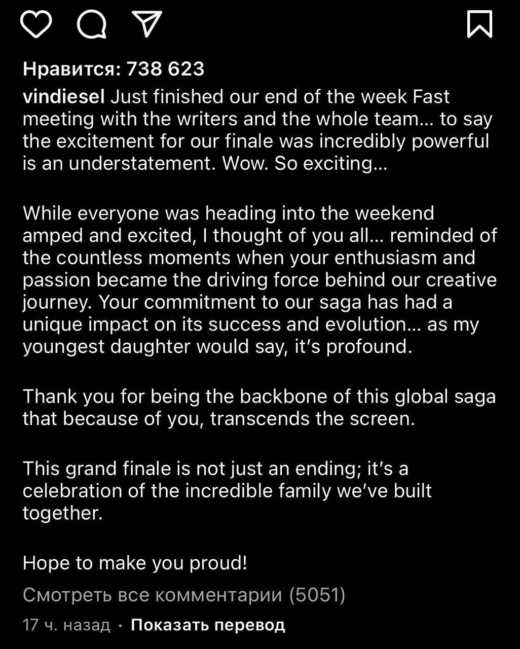 Только что завершилась наша недельная встреча со сценаристами и всей командой по поводу „Форсажа“. Этот грандиозный финал не просто завершение, это чествование невероятной семьи, которую мы создали вместе. Надеюсь, вы будете мной гордиться!» — написал он.