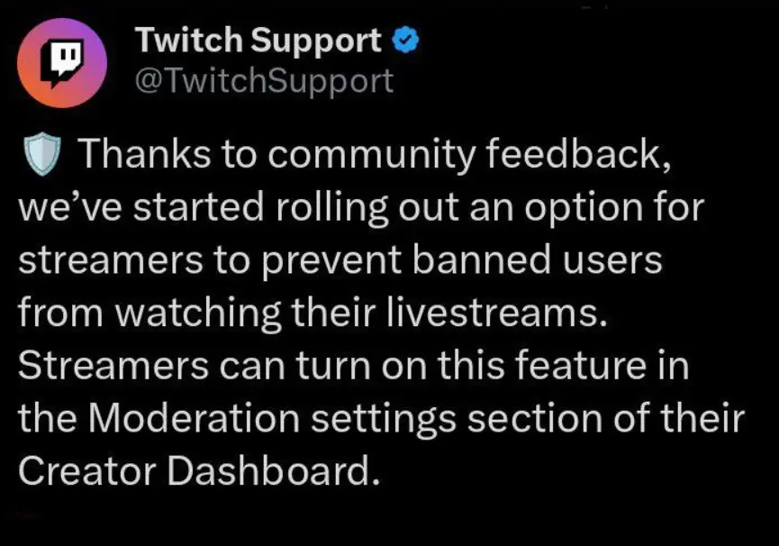 На твиче появится новая функция, которая позволит забаненным пользователям смотреть стримы стримеров, но те не смогут писать ничего в чат. Только так функция будет работать тогда, когда она выключена. Также забаненные не смогут ничего комментировать, а только смотреть небольшие видео и посты от стримеров. Это сделано для того, чтобы стримеры не теряли аудиторию из-за каких-либо возникающих проблем. Однако, если включить функцию, то забаненным пользователи не могут смотреть трансляции, а только посты.