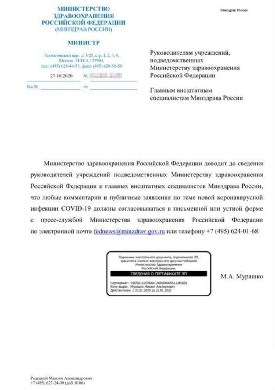 Минздрав запретил врачам публично высказываться о эпидемии коронавируса в России.