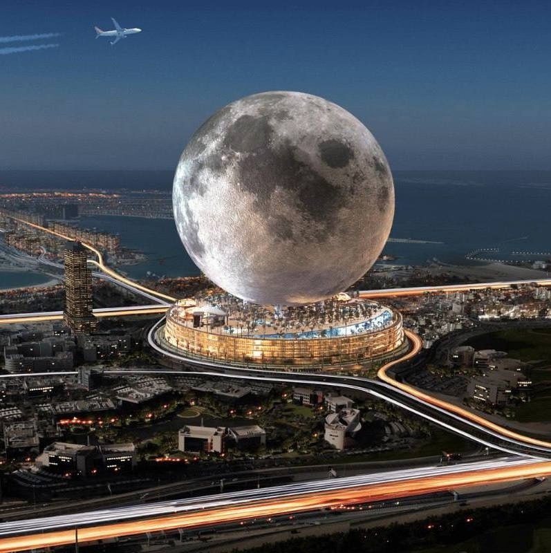 Канадская компания Moon World Resorts планирует построить в Дубае здание в форме Луны, чтобы люди могли посетить Луну, не покидая Земли. Стоимость проекта оценивается в 5 миллиардов долларов, и ожидается, что он будет завершен в течение двух лет. В сфере высотой 224 метра разместятся ночной клуб, развлекательный центр, лаунж-зона и спа-салон, добраться до которых можно будет с помощью "лунного шаттла". Кроме того, ожидается, что здание будет служить центром для космических агентств и их астронавтов, готовящихся к космическим полетам.