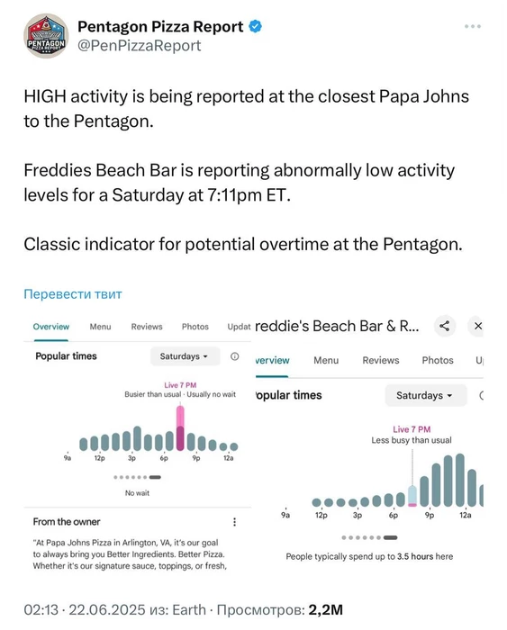 В минувшую субботу пиццерия «Папа Джонс», расположенная вблизи Пентагона, зафиксировала необычно высокий поток клиентов, что стало классическим индикатором активной работы в штаб-квартире Минобороны США. Это обстоятельство вызвало обсуждения о возможной подготовке к военной операции, так как сотрудники Пентагона, похоже, предпочли заказывать пиццу вместо обеда.
