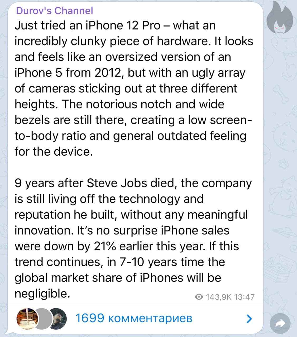 Создатель Телеграма охарактеризовал устройство как «невероятно кривой кусок железа» и обвинил Apple в паразитировании на наследии Стива Джобса.