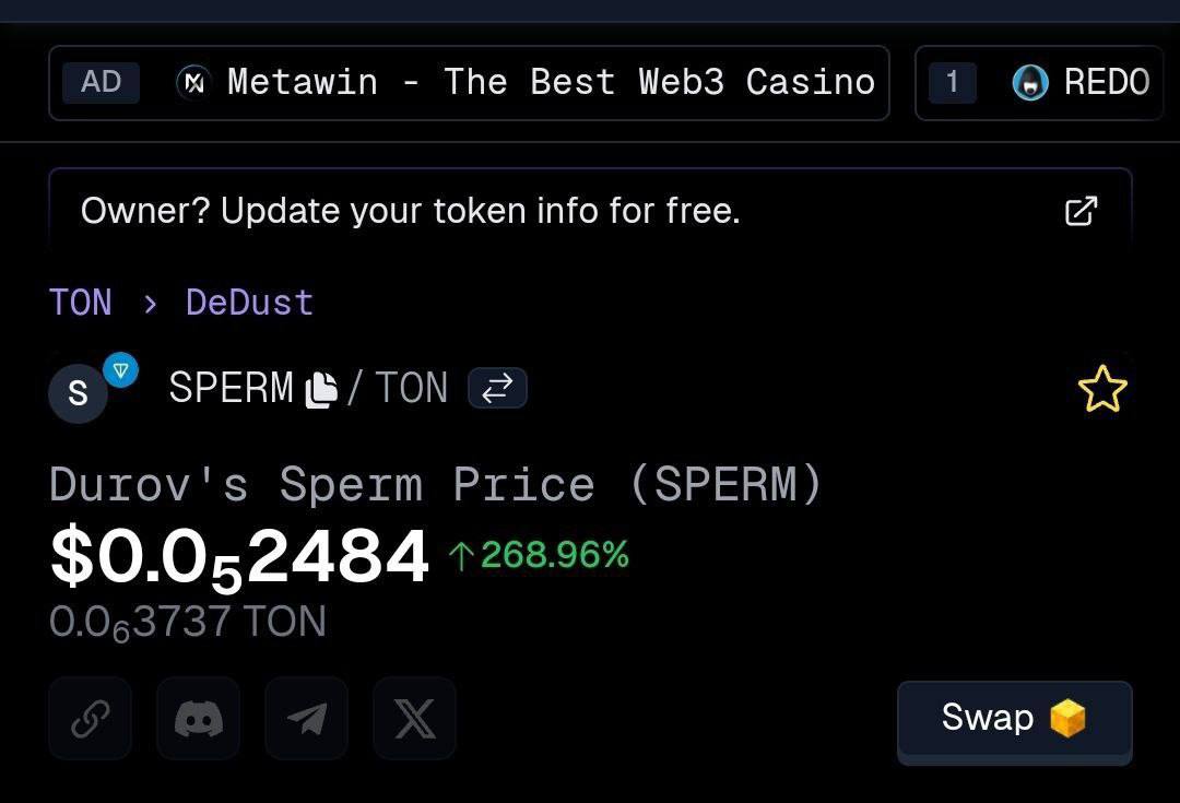 После объявления Павла Дурова о том, что он отец сотни детей, мем-коин спермы Дурова (да, есть такой) вырос почти на 270%