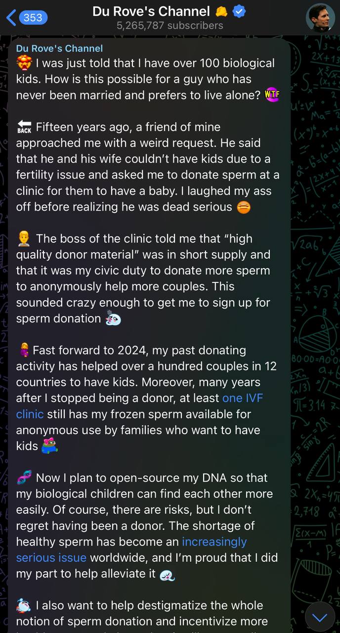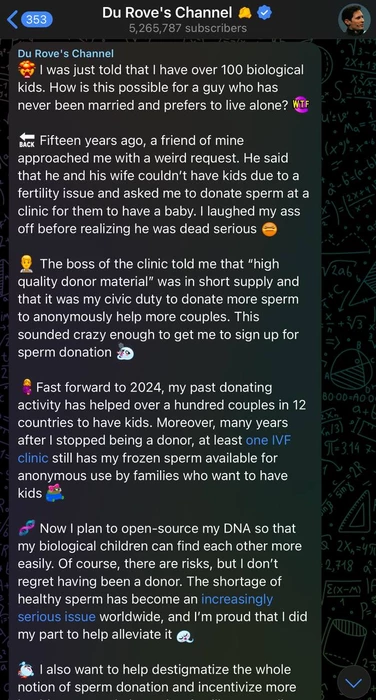Дуров в своем telegram канале раскрыл свою тайну. Оказывается, 15 лет назад у его друга не получалось оплодотворить свою жену и он попросил семя для своей жены. Паша недолго думаю поделился своей частичкой и сдал сперму, дабы спасти отношения пары. Павел вошел в кураж по сдаче семени и решил помочь еще и другим людям с похожими проблемами..