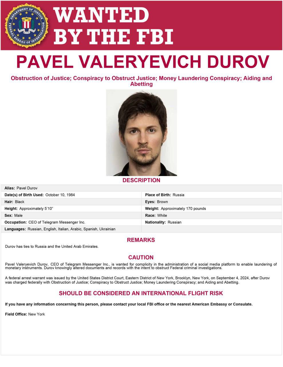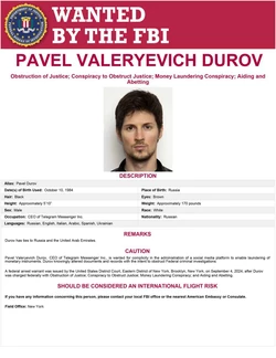 Основатель Telegramа, Павел Дуров, разыскивается по обвинениям в «Препятствие осуществлению правосудия; Заговор с целью воспрепятствовать правосудию; Заговор по отмыванию денег». Ордер на его арест был выдан 4 сентября окружным судом Нью-Йорка.