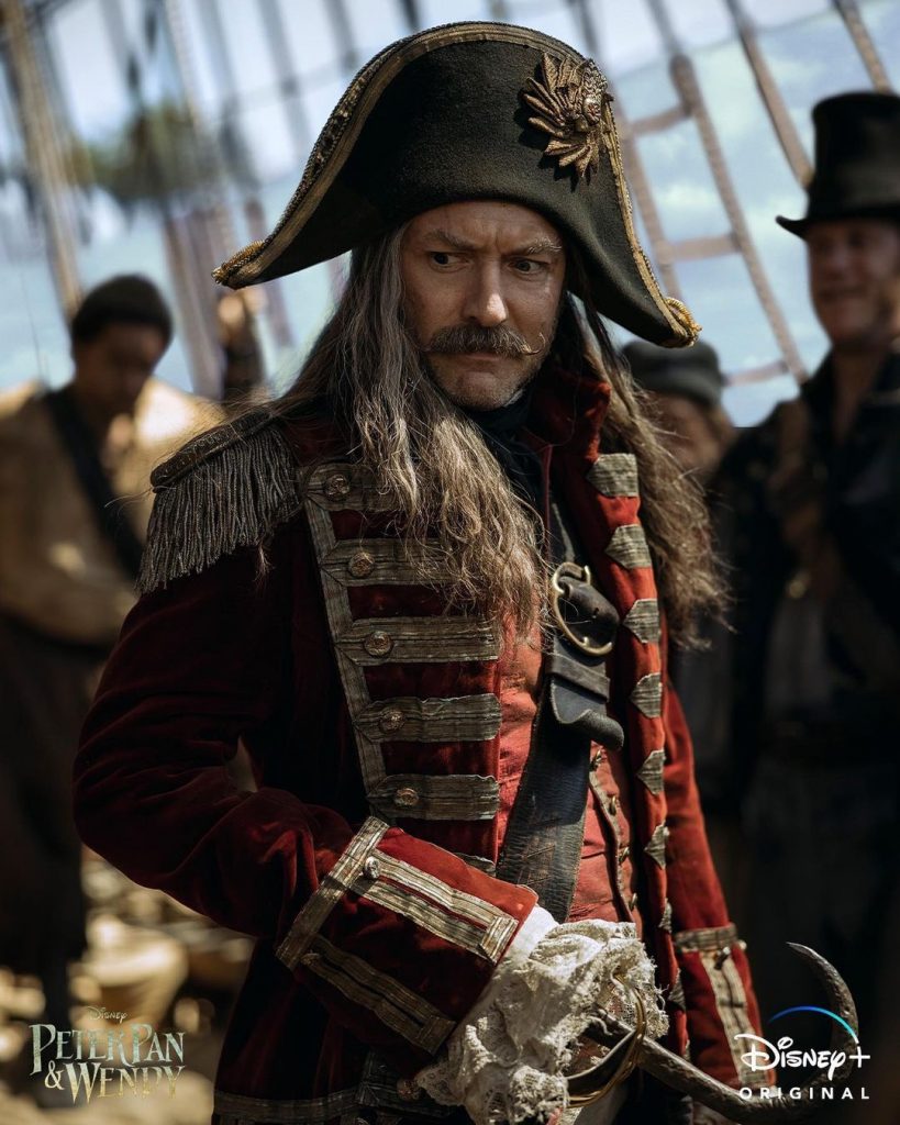 И все это определенно заслуга гримеров. Джуд Лоу появится на экранах с длинными и густыми волосами темного цвета и усами. В таком образе его не часто удается увидеть. Но все вокруг уже с готовностью могут заявить, что актер на самом деле очень похож на Капитана Крюка, который знаменит своими коварными планами.