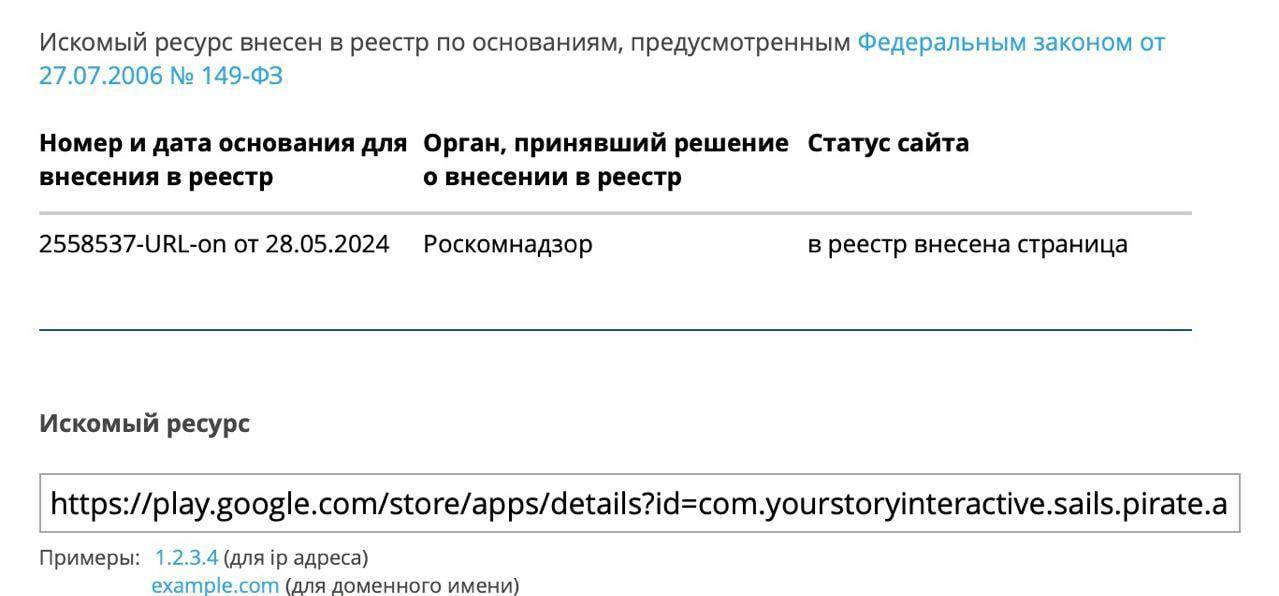 Согласно данным, в реестр были внесены ссылки на приложение «Клуб романтики» в магазинах Google Play и AppStore 28 мая. Решение о добавлении было принято Роскомнадзором. В базе указано, что статус сайта теперь «в реестре внесена страница».
