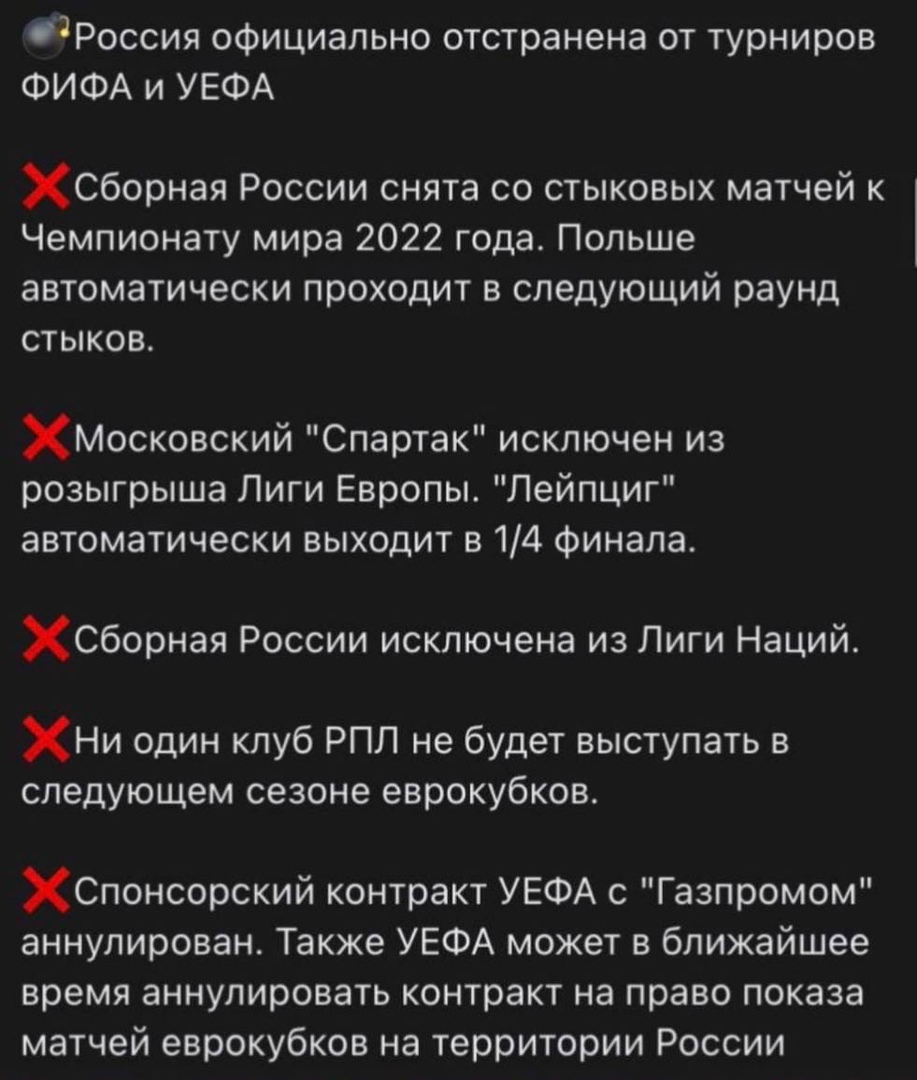 Если коротко, то Сборной России присудили техническое поражение в стыковых матчах с Польшей, ровно как и «Спартаку» в матче 1/8 Лиге Европы с «Лейпцигом». Также санкции коснулись и «Газпрома», да и в следующем сезоне наши клубы не ждут в еврокубках.