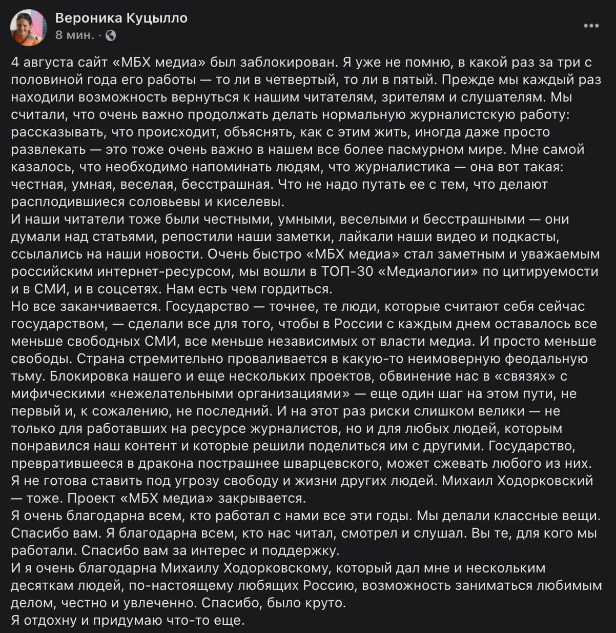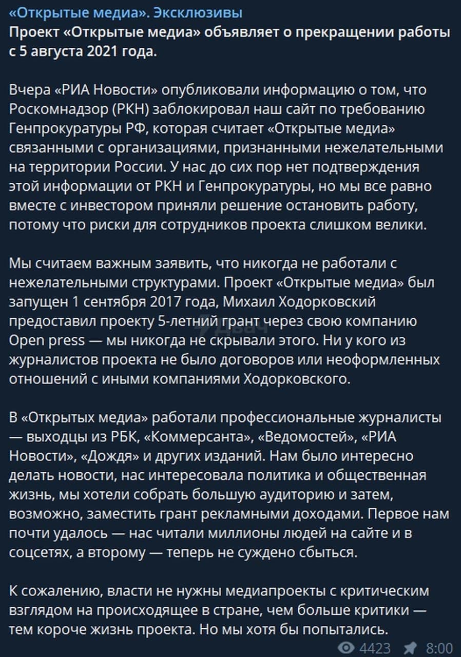Сегодня утром «МБХ Медиа» и «Открытые медиа» объявили о своем закрытии
