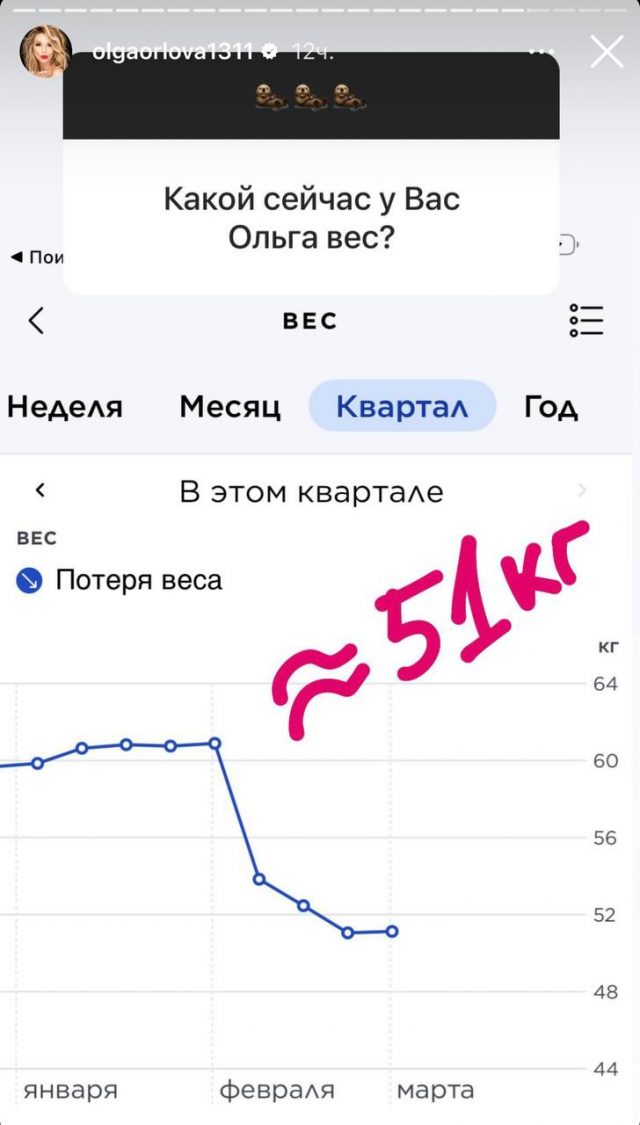 Орлова не стала скрывать, что на данный момент времени ее примерный вес составляет 51 килограмм. Ольга утверждает, что всего через несколько дней после рождения дочери ей сразу удалось сбросить 4 килограмма.