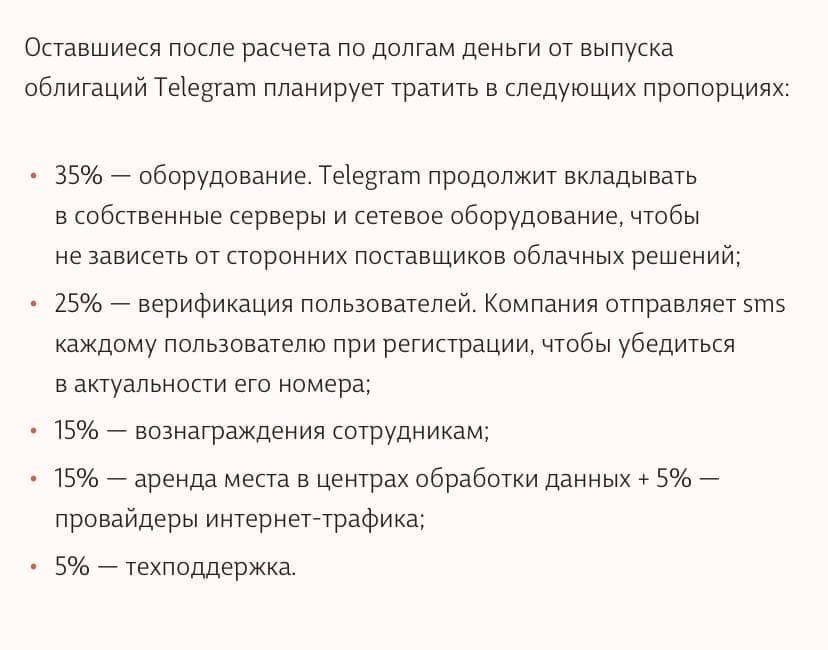 Перед Telegram висит обязательство до конца апреля текущего года вернуть инвесторам более $600 млн долга. Чтобы вырулить из этой неприятной ситуацию, команда легендарного мессенджера выступила к инвесторам с предложением вложить $1 млрд в его облигации. Также команда знаменитого мессенджера обещает целый набор выгодных проектов по монетизации Telegram, чтобы вернуть деньги за пять лет и дать компании выжить.