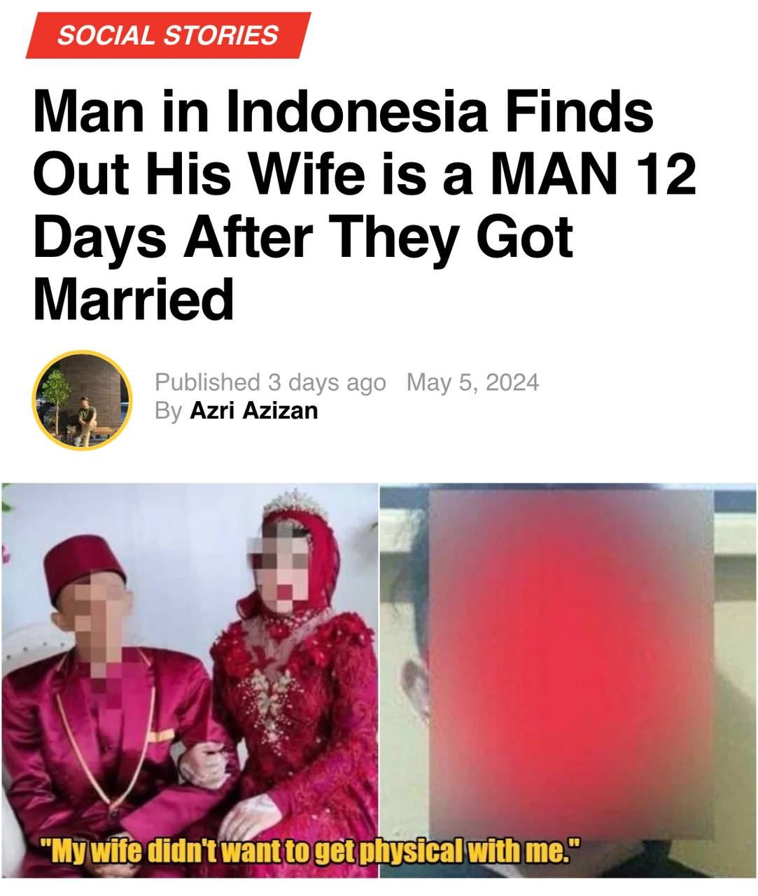 В Индонезии случилась история, которая встревожила многих: парень лишь спустя 12 дней после свадьбы обнаружил, что его жена на самом деле - переодетый мужчина. На протяжении целого года отношений парень ничего не подозревал - косметика, женская одежда и тонкий женский голос "невесты" были идеальным обманом. Подозрения начали накапливаться, когда "невеста" постоянно отказывала ему в сексе, оправдываясь различными причинами. Семья жениха обратилась к семье "невесты", которые наконец-то признались в правде. Теперь "невесте" грозит до 4 лет тюрьмы за подобное обманное поведение.