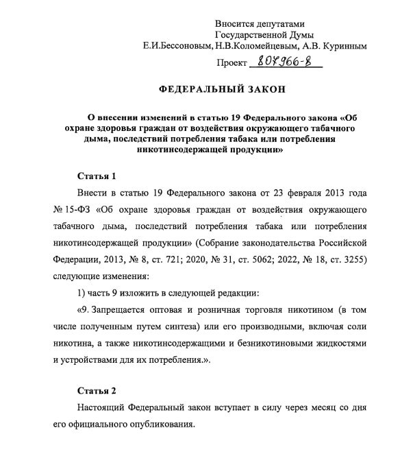 Разработанный проект федерального закона «Об охране здоровья граждан от воздействия окружающего табачного дыма, последствий потребления табака или потребления никотиносодержащей продукции» имеет своей основной целью защиту здоровья граждан Российской Федерации путём введения полного запрета на розничную продажу жидкостей, содержащих никотин, а также безникотиновых жидкостей и устройств для их использования.