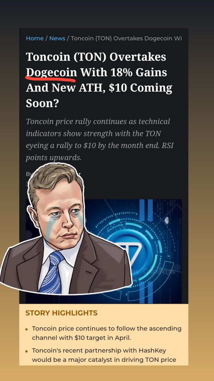 Павел Дуров опубликовал историю в своем telegram с упоминанием Илона Маска и его крипты-фаворита DOGE, в которой собственно и подшутили над Маском указав на то, что крипта TONcoin обошла дог по капитализации и заняла 8 место (и это не придел).