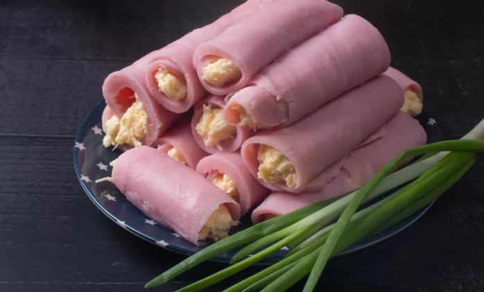 2) Распределите получившуюся начинку на ломтиках ветчины, затем аккуратно скрутите их. Выложите эти изысканные завертки на красивое блюдо и украсьте свежей, мелко нарезанной зеленью лука.
