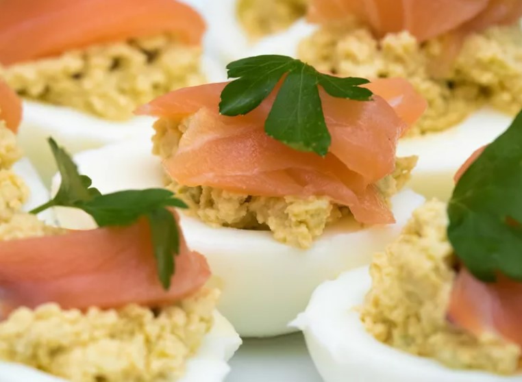3) Наполните белковые половинки изысканной начинкой, придавая им яркость с помощью каперсов или маслин в качестве украшения.