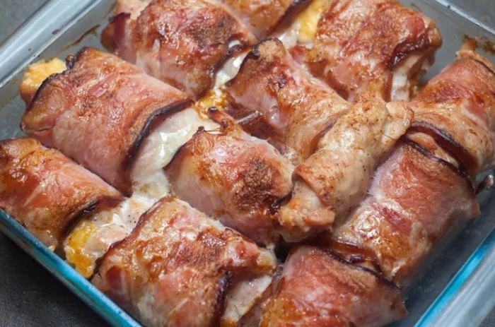 1) Заверните кубики ананаса в хрустящий бекон, аккуратно заколите их деревянной шпажкой, создавая гармоничное сочетание вкусов.