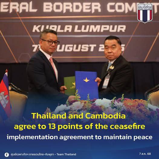 Сегодня, 7 августа 2025 года, в Малайзии состоялась историческая встреча военных лидеров Таиланда и Камбоджи, результатом которой стало подписание соглашения о прекращении огня. Стороны достигли договорённости по 13 ключевым пунктам, направленным на снижение напряжённости и предотвращение будущих конфликтов на границе.