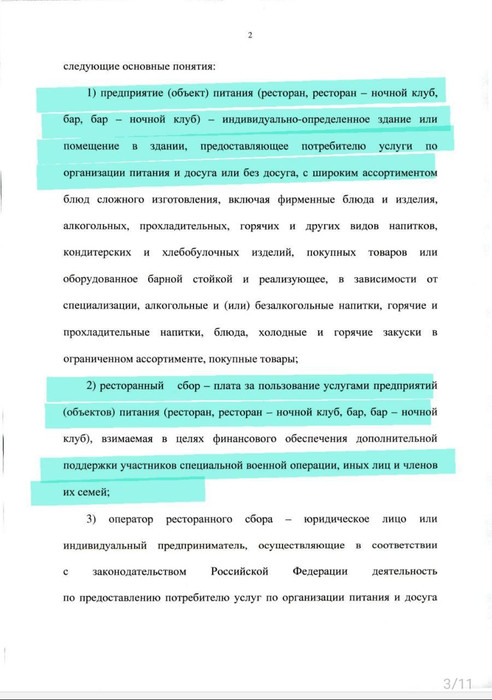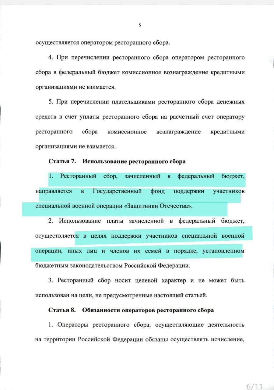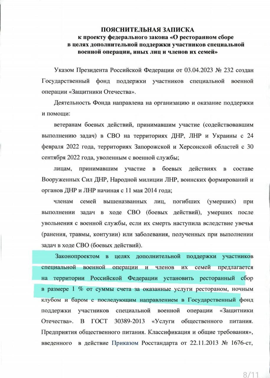 В Госдуму внесён законопроект, предусматривающий введение сбора в размере 1% для посетителей ресторанов, баров и клубов. Деньги будут направлены на «поддержку участников СВО».