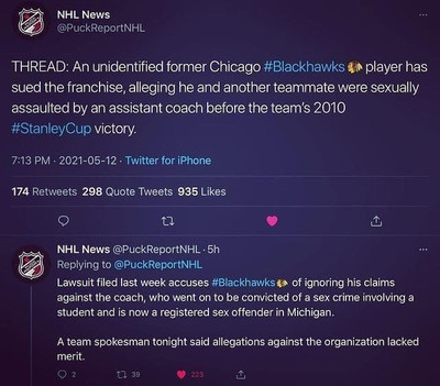 Неизвестный бывший игрок «Чикаго Блэкхокс» подал в суд на этот клуб Национальной хоккейной лиги, утверждая, что он и другой его партнер по команде подверглись сексуальному насилию со стороны помощника главного тренера. Это происходило перед победой команды в розыгрыше Кубке Стэнли в 2010 году.