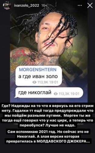 Недавно Ваня сказал Моргенштерну, что, скорее всего, никогда не вернется на стримы Некоглая, так как ему не нравится его поведение сейчас. Он назвал Колю молдавским джокером и сказал, что тот изменился в худшую сторону и стал очень злым. А вы хотели бы ..