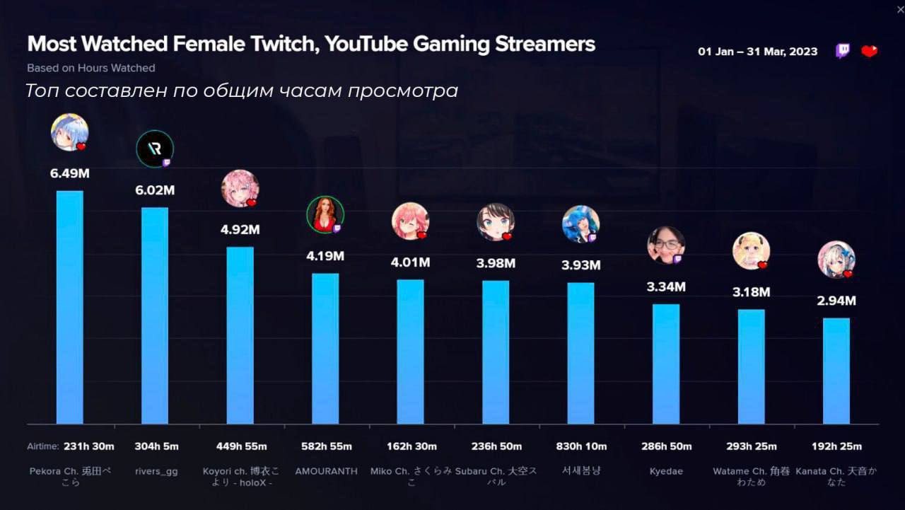 Выяснилось, что в топе Твитча самыми популярными стримершами являются виттьюберши - виртуальные анимешные тянки. Они заняли почти весь топ-10 по просмотрам, включая первые три места.