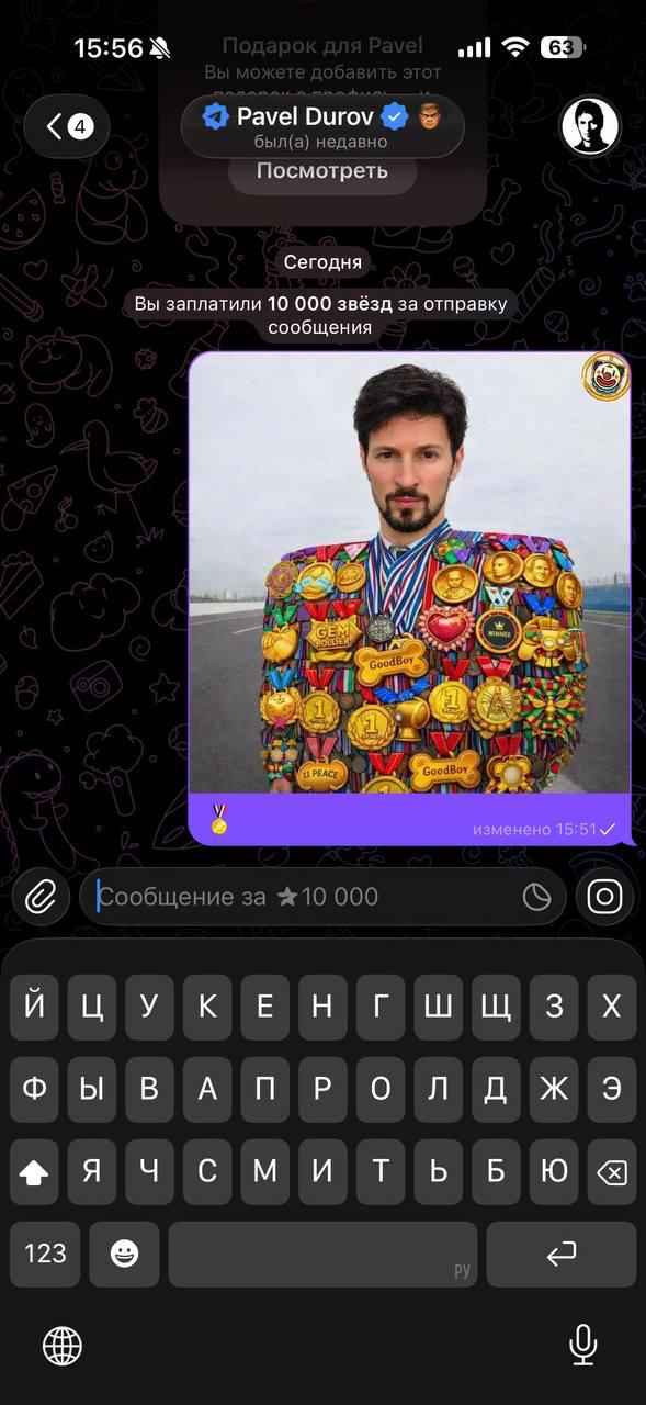 Один пользователь (@rasul) вообще разошёлся — отправил Дурову личку за 10 000 Stars с фоткой, где Павел в медалях, и написал что-то в духе «ты легенда, держи уважуху». Это сообщение быстро разлетелось по скринам, и теперь все обсуждают, ответит ли Дуров или просто поставит лайк. Telegram превратился в фестиваль мемов и наград — пользователи соревнуются, кто круче заюзает медали и сделает смешнее мем про основателя. Дуров молчит, но его лицо везде — это уже новый тренд 2026 года.