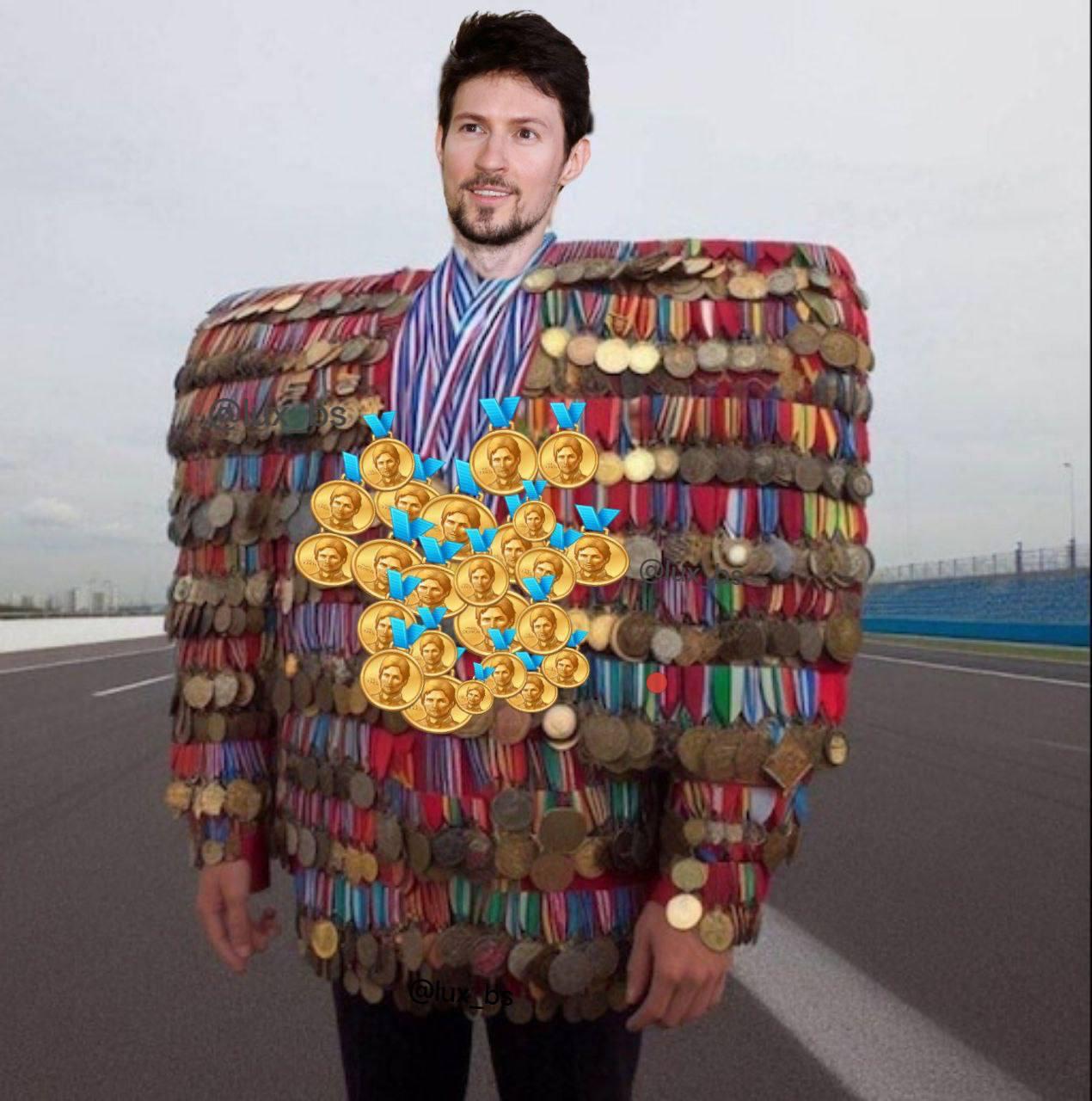 После выхода свежих медалей в Telegram пользователи взорвали чаты и каналы мемами с Павлом Дуровым. Самая популярная медаль «The Founder» сразу пошла в народ — её лепят на фото Дурова, где он в кепке, в очках, на фоне логотипа Telegram. Люди шутят, что он теперь официально «медалист года», «отец медалей» и «заслуженный основатель». Мемы летят везде: Дуров с золотой медалью на шее, с кучей наград как генерал, или в позе победителя Олимпиады. Чаты переполнены — от «Дуров — король стикеров и медалей» до «Павел, дай медальку за лайки».