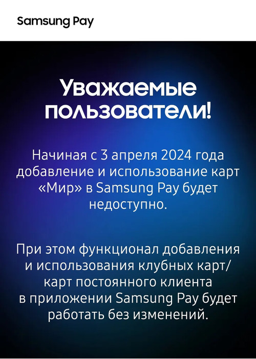 Со 3 апреля 2024 года в Samsung Pay будет прекращено добавление и использование карт «Мир». Ранее добавленные карты данного типа будут удалены из приложения. Однако поддержка карт лояльности, включая клубные карты и карты постоянного клиента, останется без изменений.
