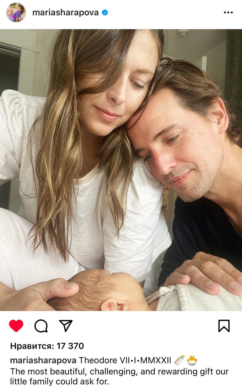Бывшая российская теннисистка, экс-первая ракетка мира, Мария Шарапова стала мамой. Об этом она сообщила в своем профиле: «Теодор VII.I.MMXXII. Самый красивый, сложный и полезный подарок, о котором только может мечтать, наша маленькая семья».
